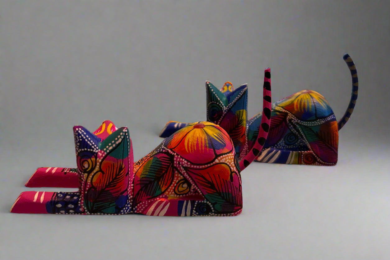 Brightly painted, whimsical wood carvings made in the Oaxaca, Mexico.