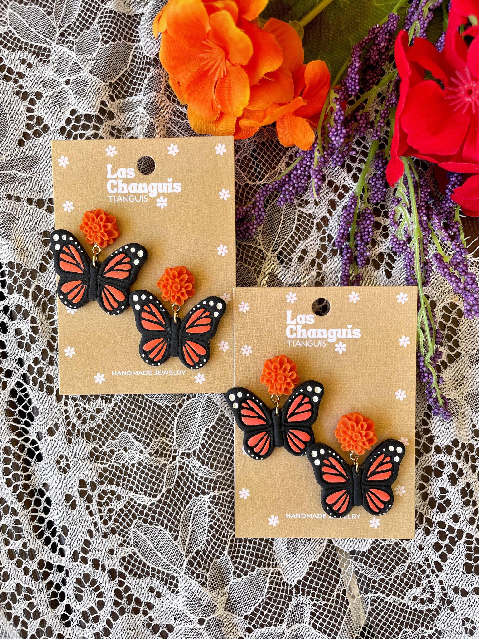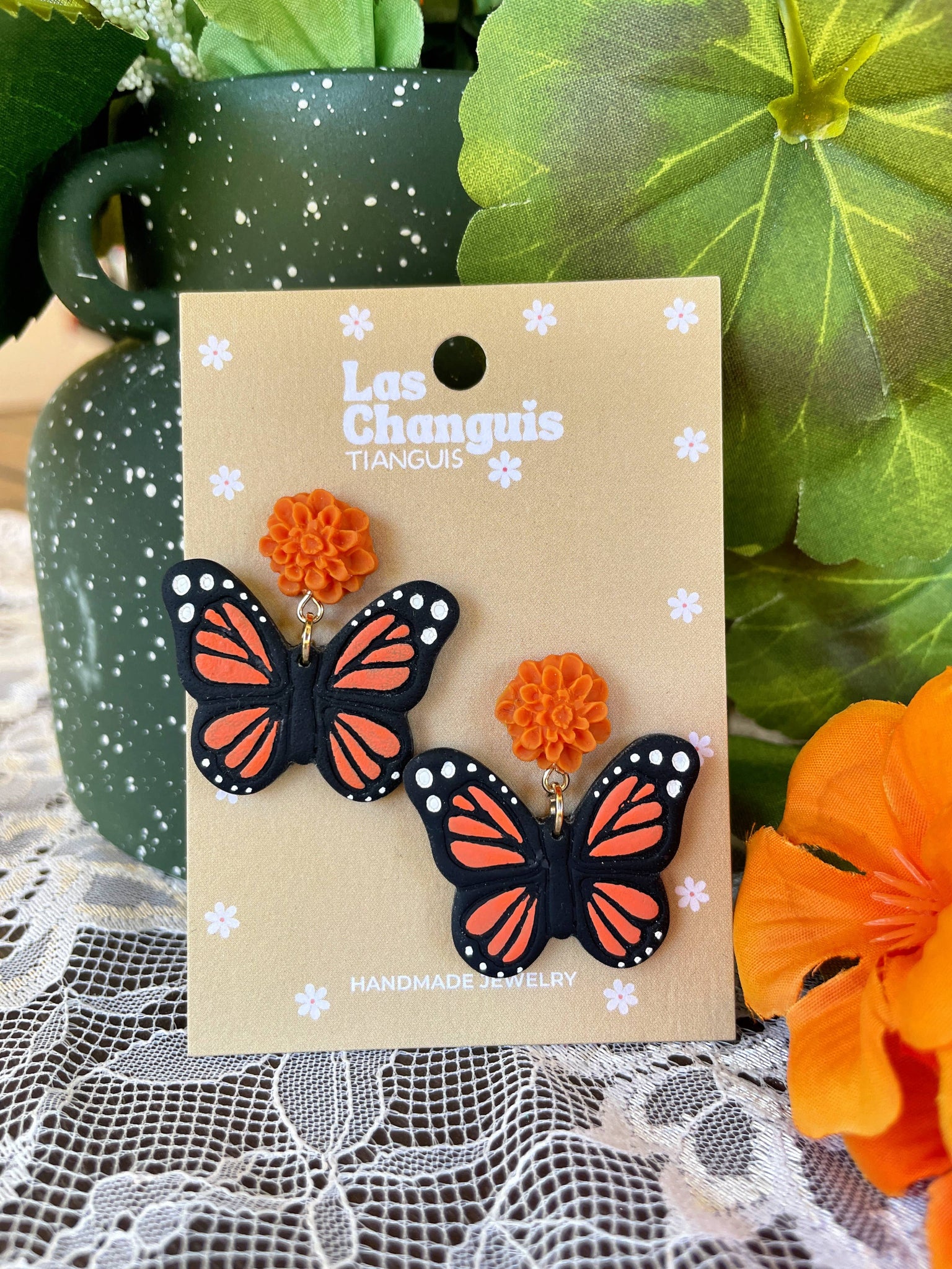 Monarch Butterfly Earrings with Cempasuchil Flowers - Day of the Dead Collection - Dia de los Muertos Jewelry
