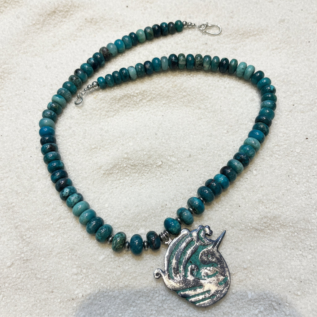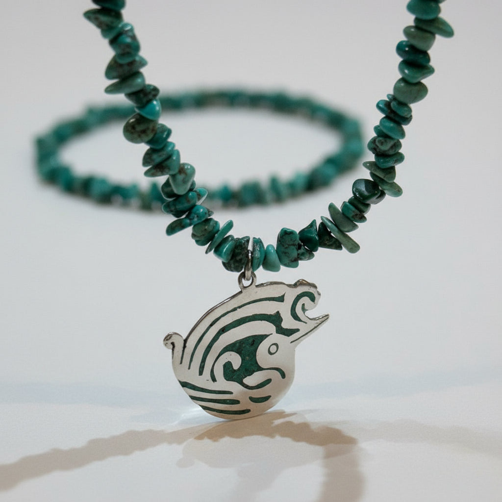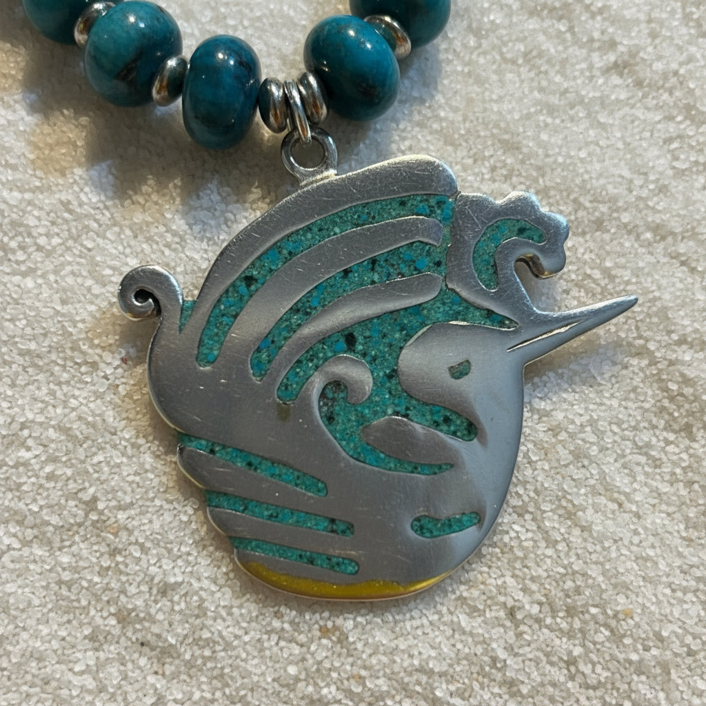 Singing Chuparosa with Turquoise Inlay on Chrysocolla Necklace - Doreen Villanueva